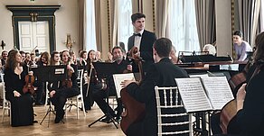 Im Programm des Konzerts am 6. April 2026 standen Werke für verschiedene Instrumente mit Orchester von Bach, Mozart, Dvorak & Saint-Saens. Von Mozart erklang das berühmte Konzert Nr. 20 d-Moll KV 466 - das erste aus der Reihe seiner großen Klavierkonzerte aus der Wiener Zeit. In der Tradition der damaligen Zeit hat Orchesterleiter Roman Salyutov den Solopart gestaltet und zugleich dirigiert.